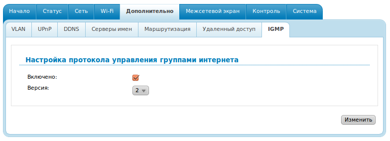 Заходим в раздел Дополнительно, открываем вкладку IGMP и проверяем - в строкеВключено должна стоять галочка, в строке Версия из выпадающего списка должно быть выбрано значение 2. Если параметры иные - меняем их и нажимаем на кнопку Изменить.