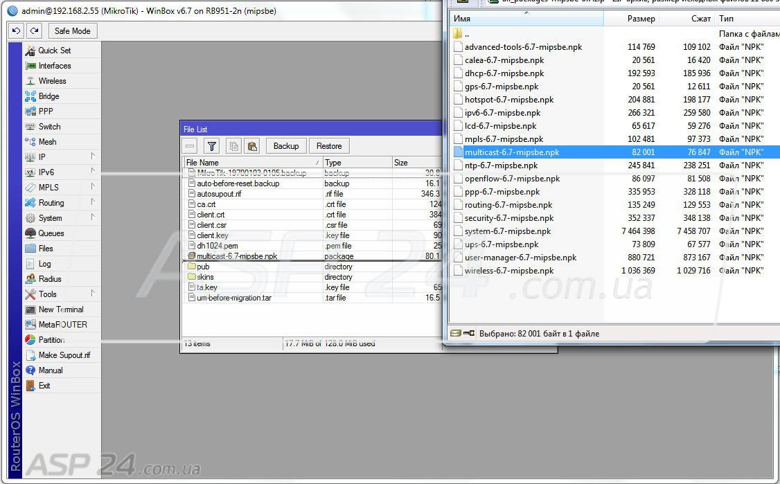 Далее, распаковав архив, найти в нём файл multicast-xx-xxxx.npk и подключится к маршрутизатору. При помощи фирменной утилиты Winbox, нужно переместить его (Drag&Drop) в окно раздела меню Files, как показано на изображении ниже.