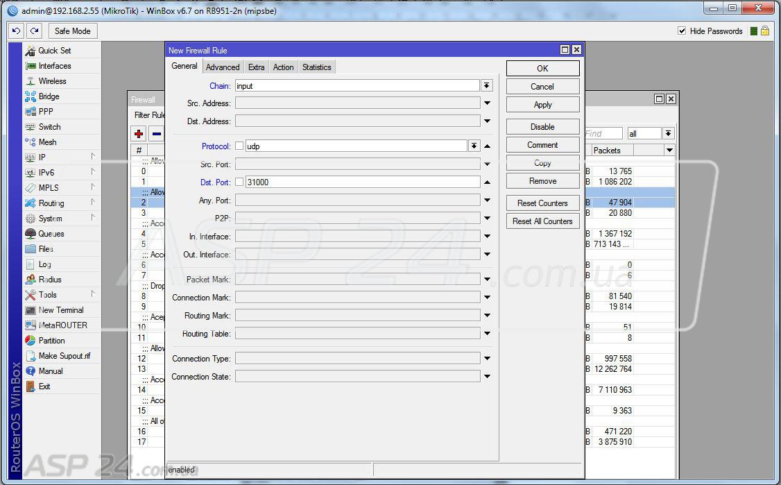 Рис. 9. На вкладке Filter Rules добавляем запись: Chain – input; Protocol – udp; Dst Port